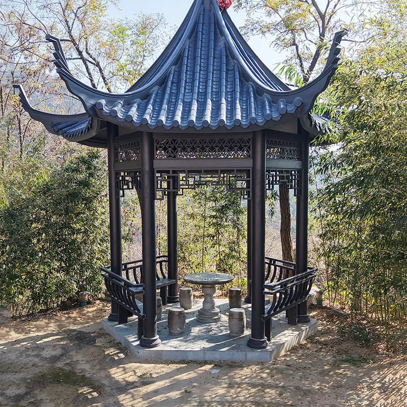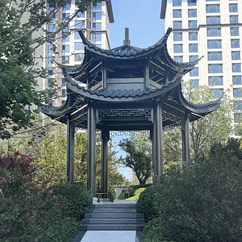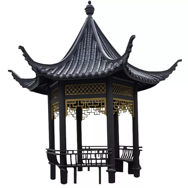 Qədim Stil Replika Pavilyonu (5000×5000mm): 120×120mm möhkəmləndirilmiş postlar, dougong strukturu, şəffaf oyma asma komponentləri ilə. Opsiyonel olaraq mədəni məkanlar və mənzərəli ərazilər üçün uyğun olan boru və ya şüşəli plitələrdən istifadə edir.